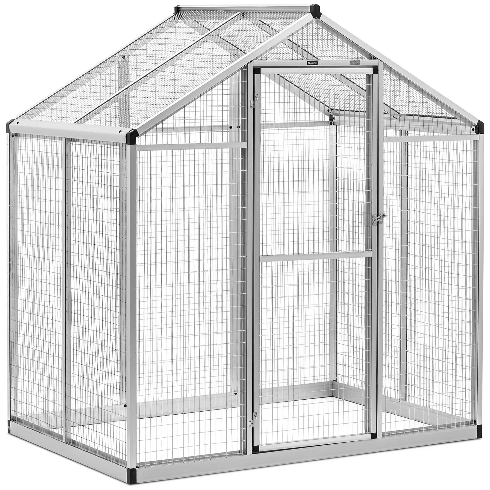 Este aviario reúne una estructura sólida de aluminio y acero galvanizado, resistente a la corrosión, y una imagen atractiva. Su montaje ha resultado algo más difícil de lo esperado pero ha valido la pena. Puerta de apertura bastante práctica, al contrario que en el caso anterior. Puede complementarse con un toldo de quita y pon.